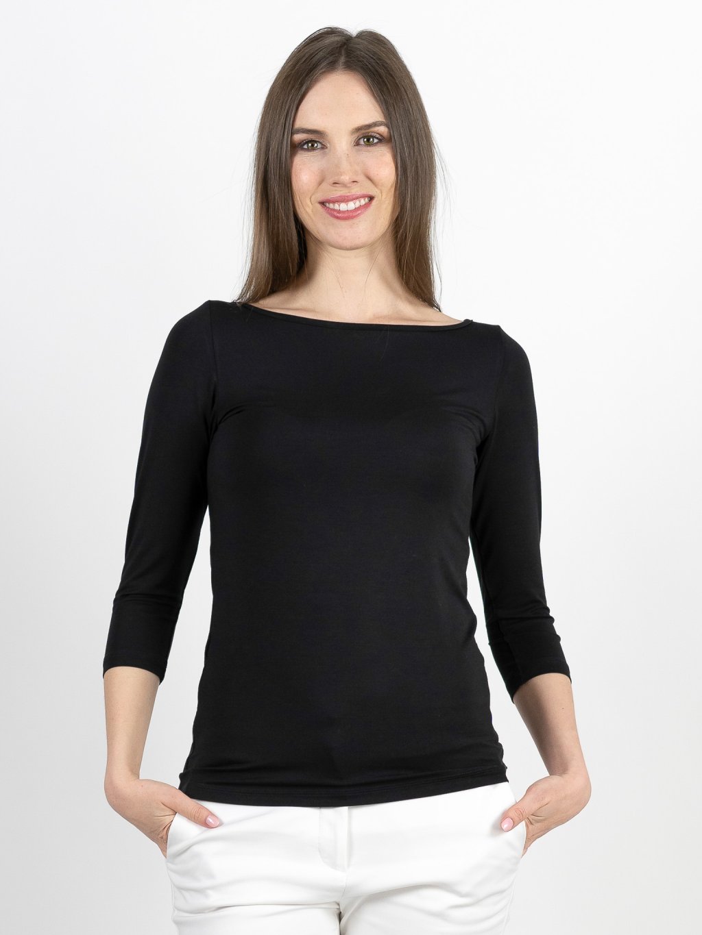 Kombinace lodičkového výstřihu a 3/4 rukávu je sázkou na nadčasovou ženskost. Tento top funguje v zimě jako dokonalá základní vrstva pod sako nebo rozepnutý svetr – postará se o Váš tepelný komfort, zatímco Vy budete vypadat elegantně za každé situace.