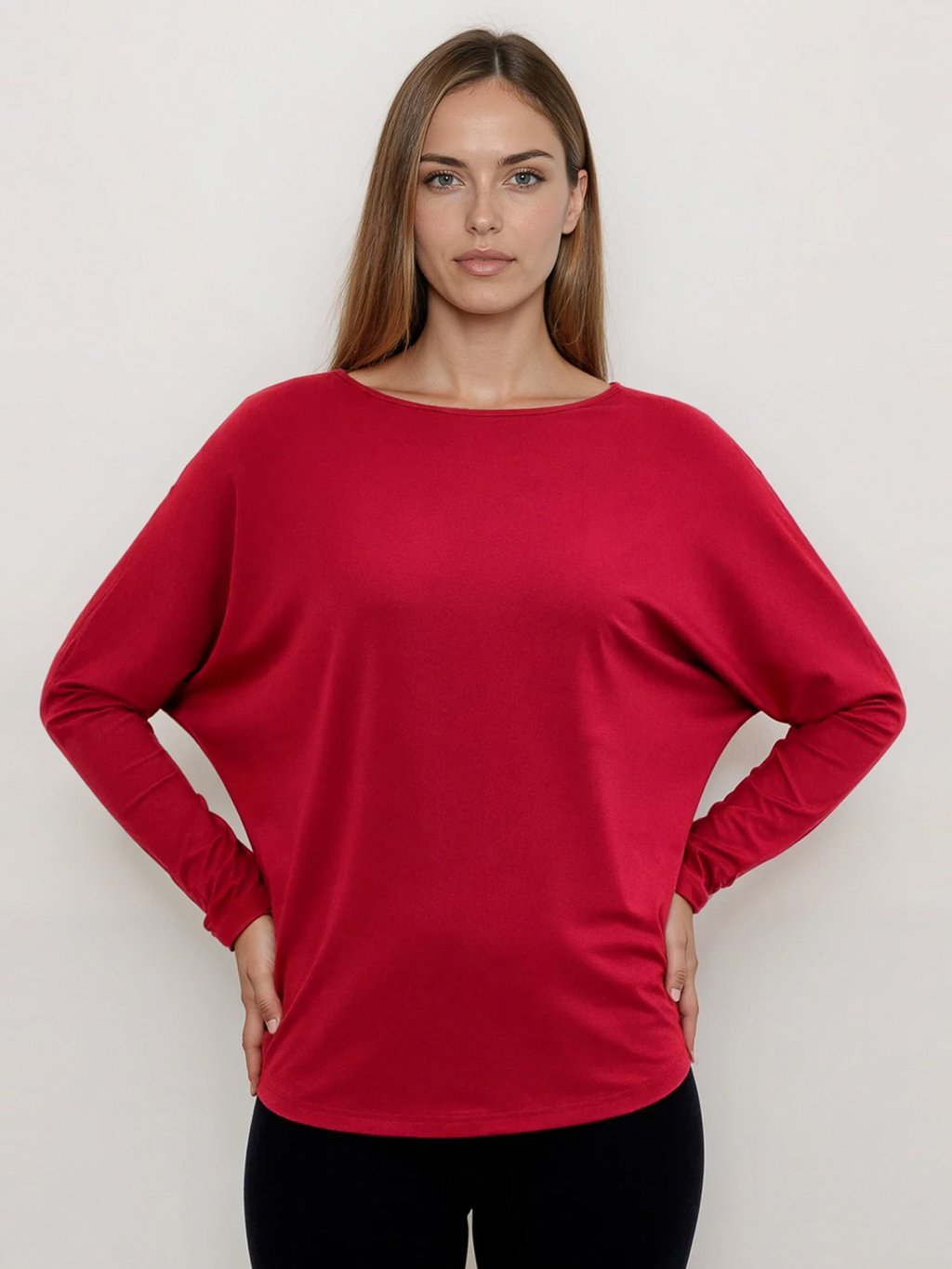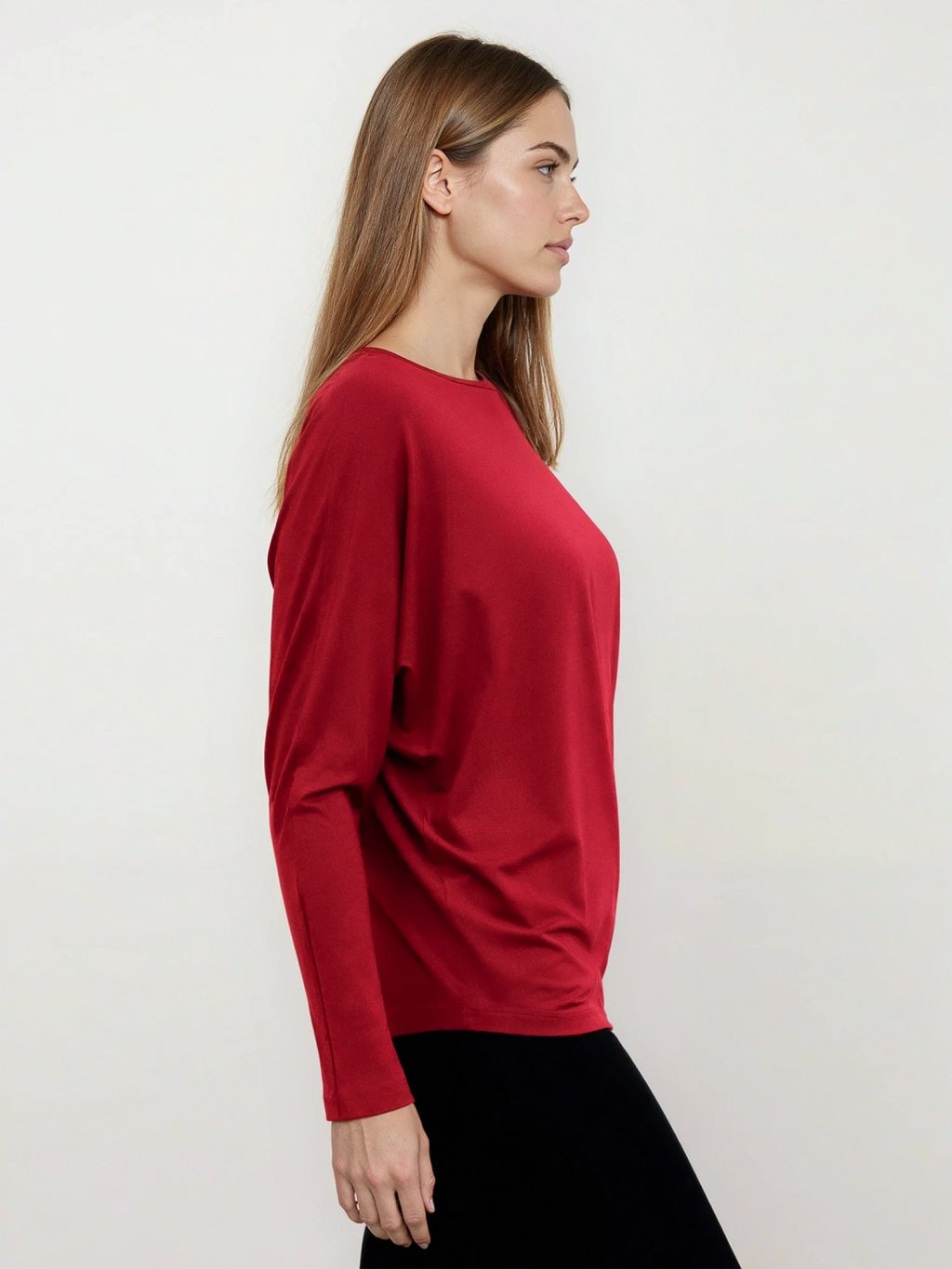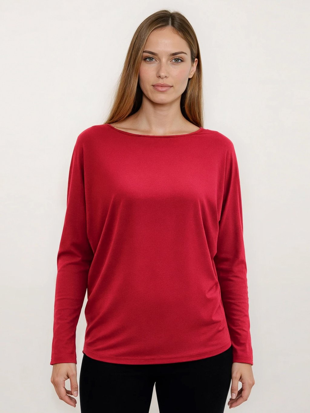 Tento top s netopýřím střihem a dlouhým rukávem je vyroben z bambusové viskózy, která je jemná, hladká a prodyšná. Červená barva dodává energii a šmrnc.