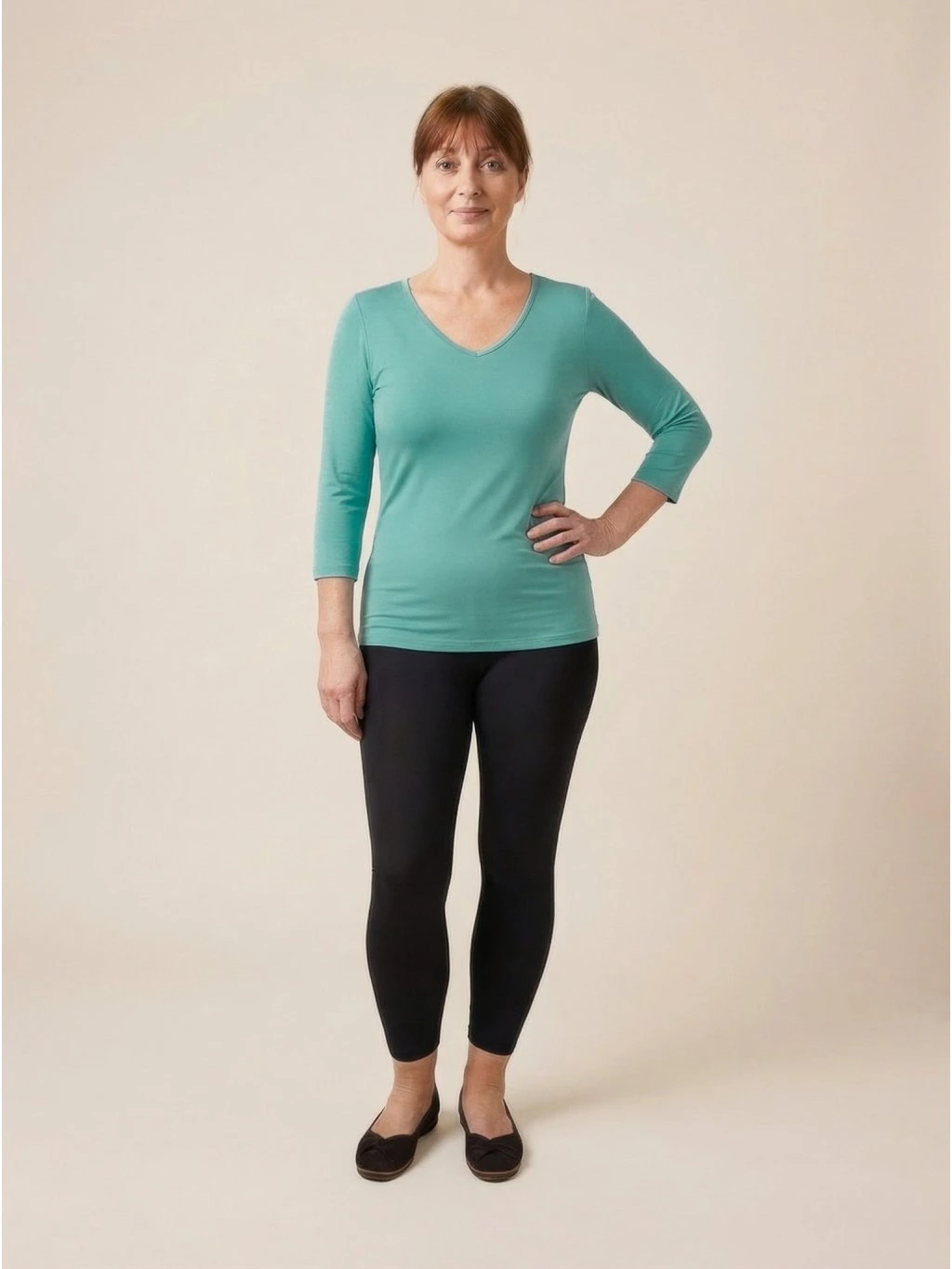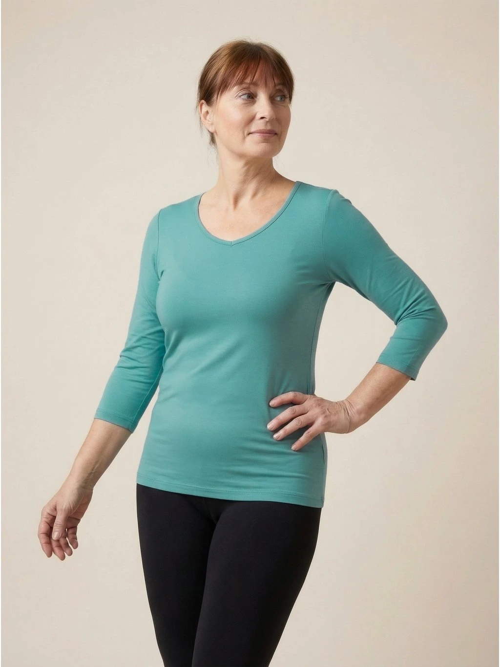 Tričko Heart s 3/4 rukávem v modrozelené tealové barvě přináší svěží pohled na Barvu roku 2026. Tento jemný pastelový odstín v kombinaci se zaobleným V-výstřihem vytváří moderní a elegantní základ, který vám doslova přiroste k srdci.